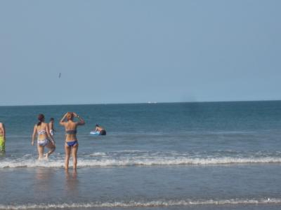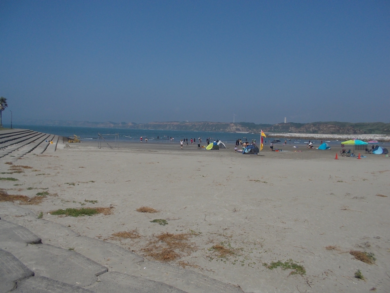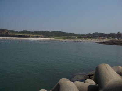 駐車場も広く、銚子電鉄の「銚子駅」にも近いので、人気の海水浴場です。 海の家もあり、ライフガードもいるので安心して泳げます。 遠くには「屏風ヶ浦」が見えるし、ときどき成田空港に離発着する飛行機も、上空を飛んでいます。