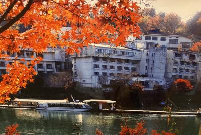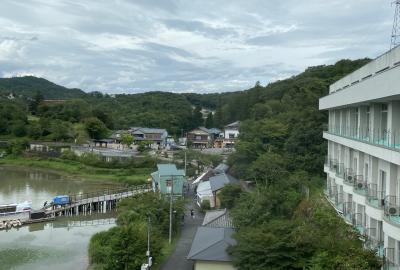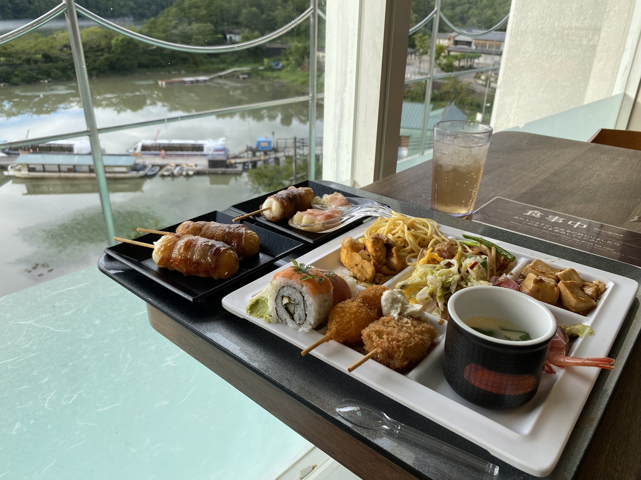 湯快リゾートから昨年大江戸温泉物語になりました。事前に大江戸温泉物語のネット予約で加賀温泉駅からの送迎バスも予約できるので、アクセスは抜群です。駅からは約30分ほどで、館は山中温泉の中心のゆげ街道から少し離れたところにあります。部屋からの眺望はリバービューです。食事はご当地グルメ満載の朝夕バイキングです。温泉も広く、PM15:00チェックイン、AM11:00チェックアウトなのでかなりゆったりできます。