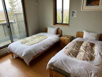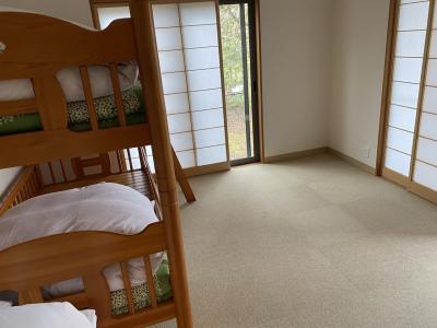 車が走れる砂浜のある千里浜レストハウスから約30分の志賀にあるハートランドヒルズin能登は15件からなる貸別荘です。シャディナカガワで受付を済ませ車で10分くらいの山の中にある別荘地に点在してます。今回の別荘はオフシーズンで1人12,000円~で、人数が増えると割引になります。寝室は洋室が2階に2部屋、1階に和室2段ベッドが1部屋あります。リビングダイニングも広く、外にはバーベキューコンロもあります。ペットアメニティーはないですが、寝室とお風呂場以外はペット可です。