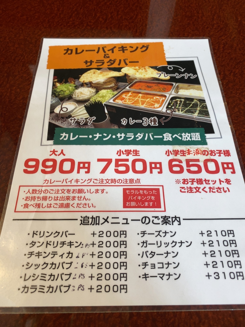 ランチ時に来ました。990円でインドカレーバイキングをやってます。カレーは3種類とスープ、ライス、サラダバー、ナンが食べ放題です。インド風のサラダもあり別料金でドリンクバーもあります。もちろんインドカレーの単品メニューもあります。本格的なインドカレーを格安でたべれます。