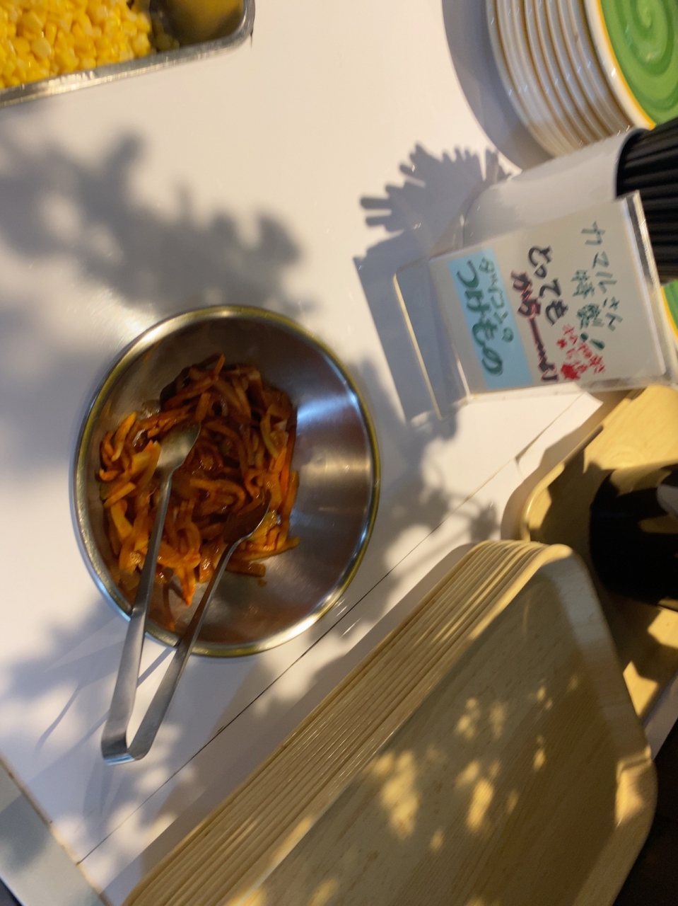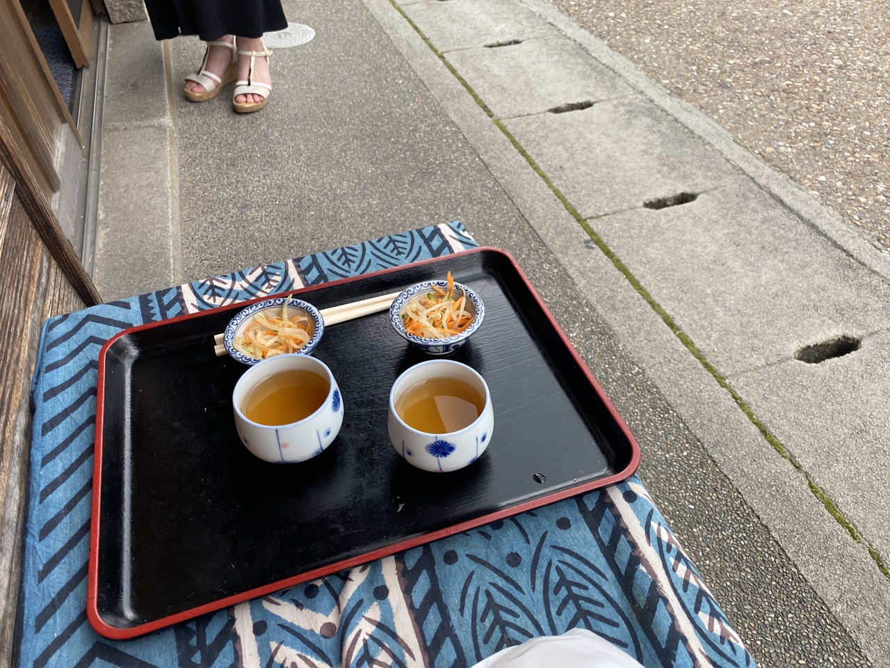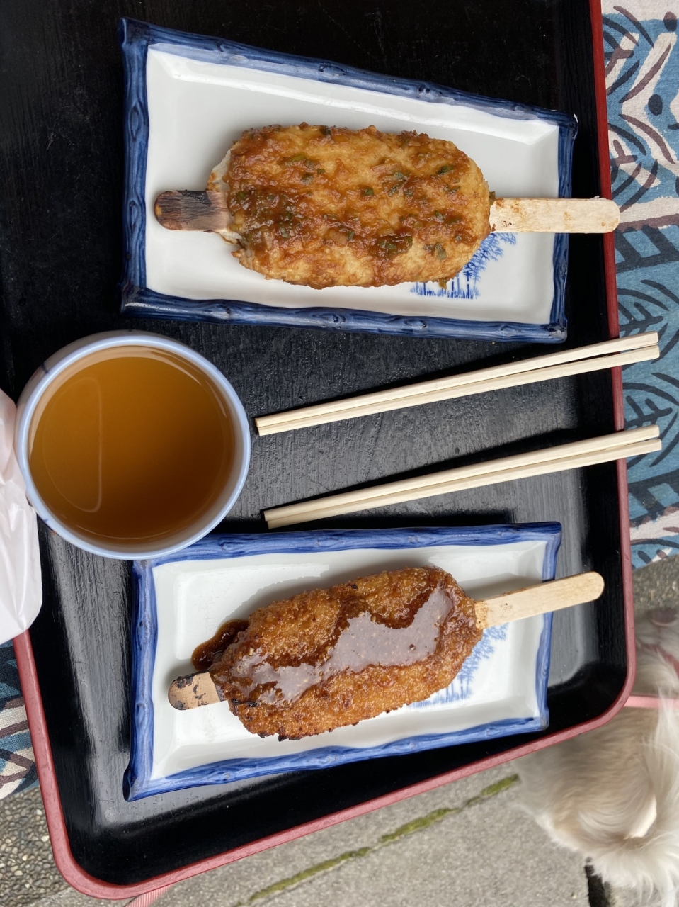 ここの五平餅は岩村唯一の小判型の五平餅のオーソドックスな形です。地元のネギと手作りした味噌のものと、ごまだれ味と2種類あります。ボリュームがほかの店よりあります。ペット連れは外にベンチもあり、お茶と小鉢をサービスしてくれました。ねぎ味噌味おすすめです。