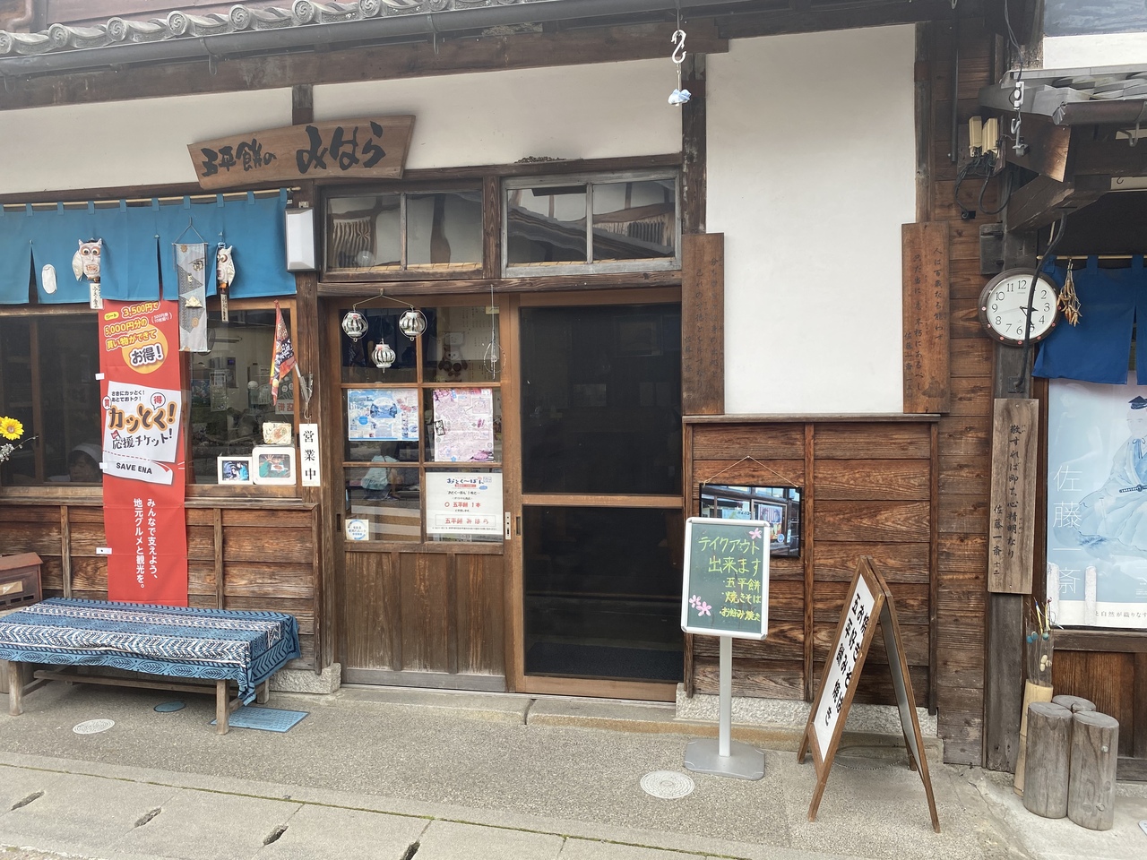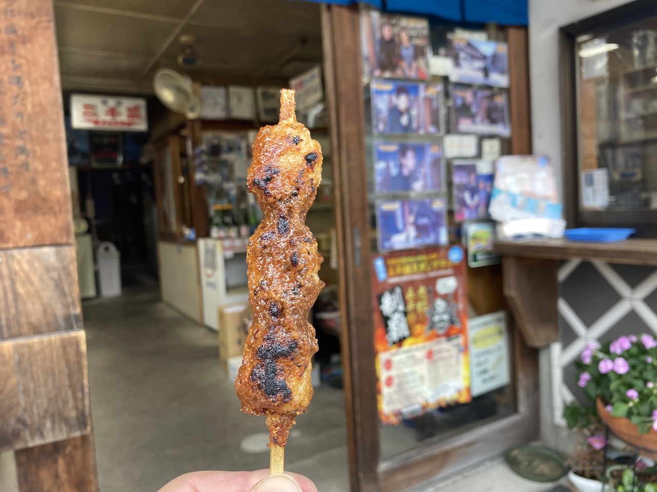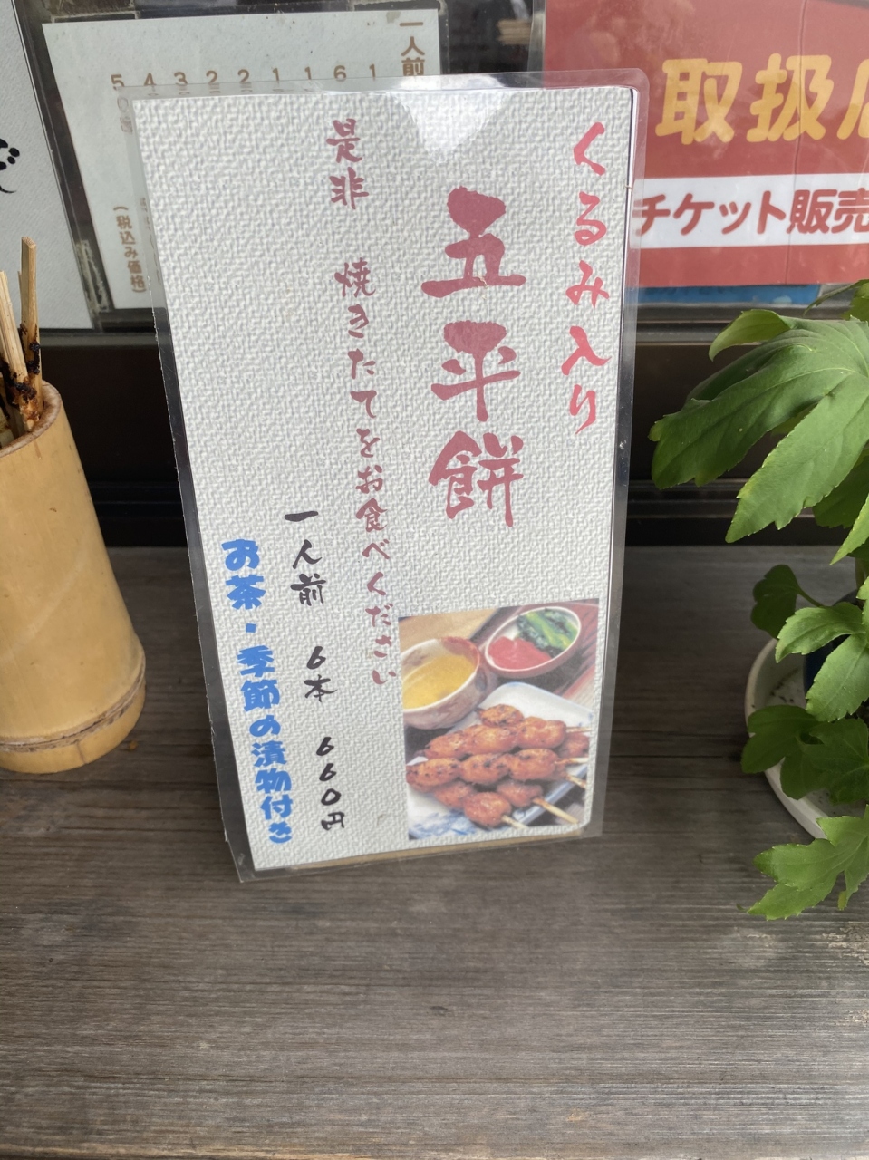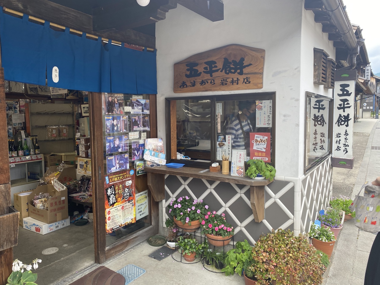 岩村に3店舗五平餅店はありますが、私的にここのくるみとゴマの香ばしい味で表面がカリッとしてるのでイチオシです。お店は岩村駅の近くで民家が多いとこなので中心街よりはなれてます。日本酒がたくさんある酒屋に併設されてます。