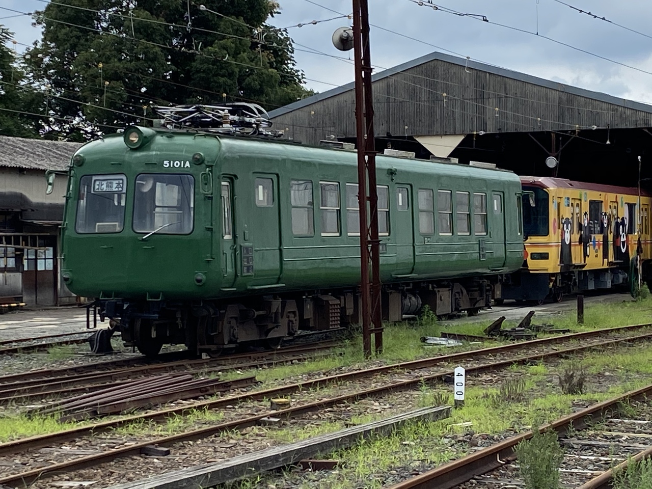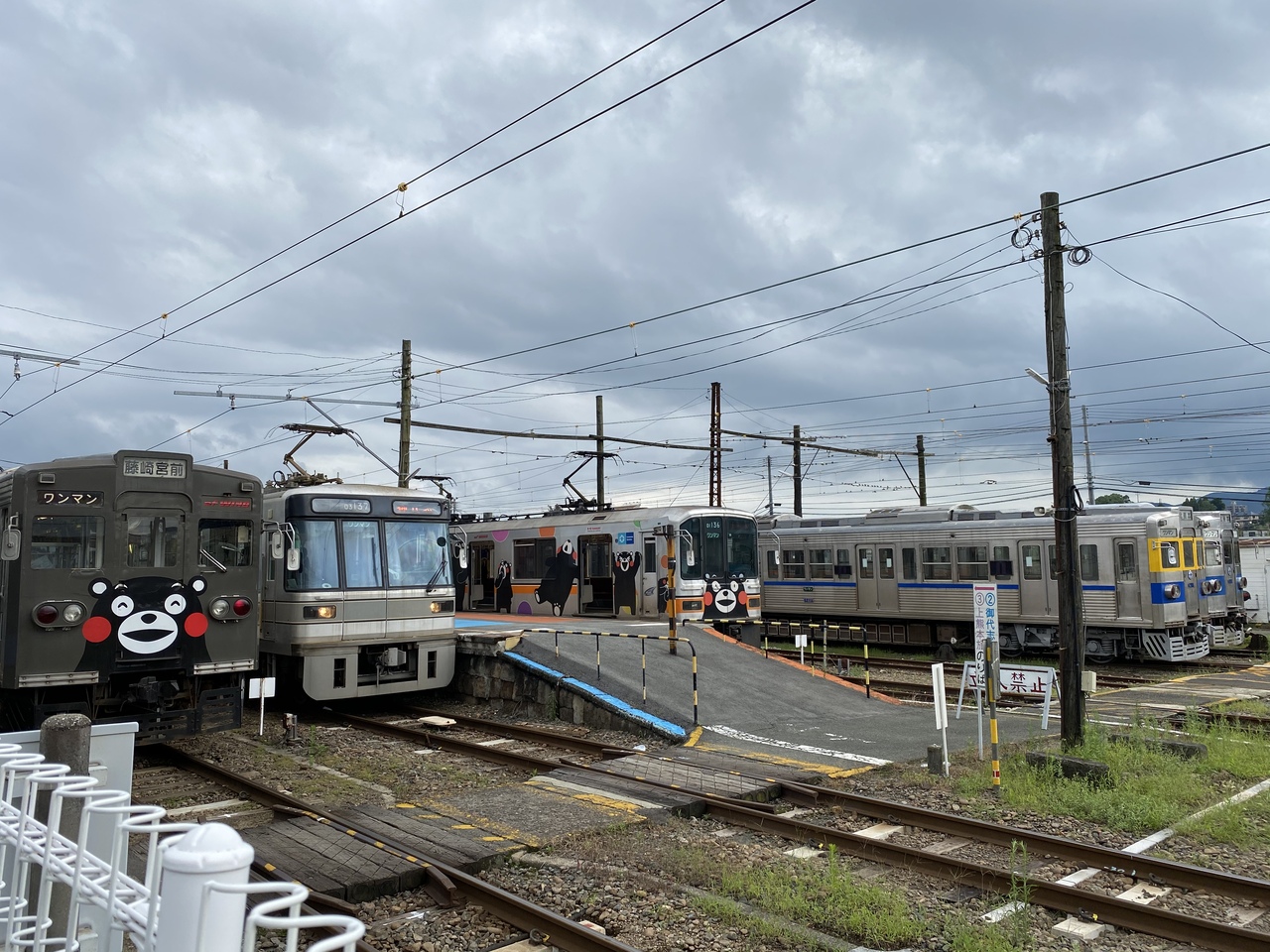 熊本電気鉄道の電車庫です。くまモン電車のショップも駅にあります。元東急電鉄の青ガエルや車庫の奥にレトロな車両も止まってます。この鉄道の中心駅で乗り換えができます。車両は東京の地下鉄から来た車両がほとんどです。