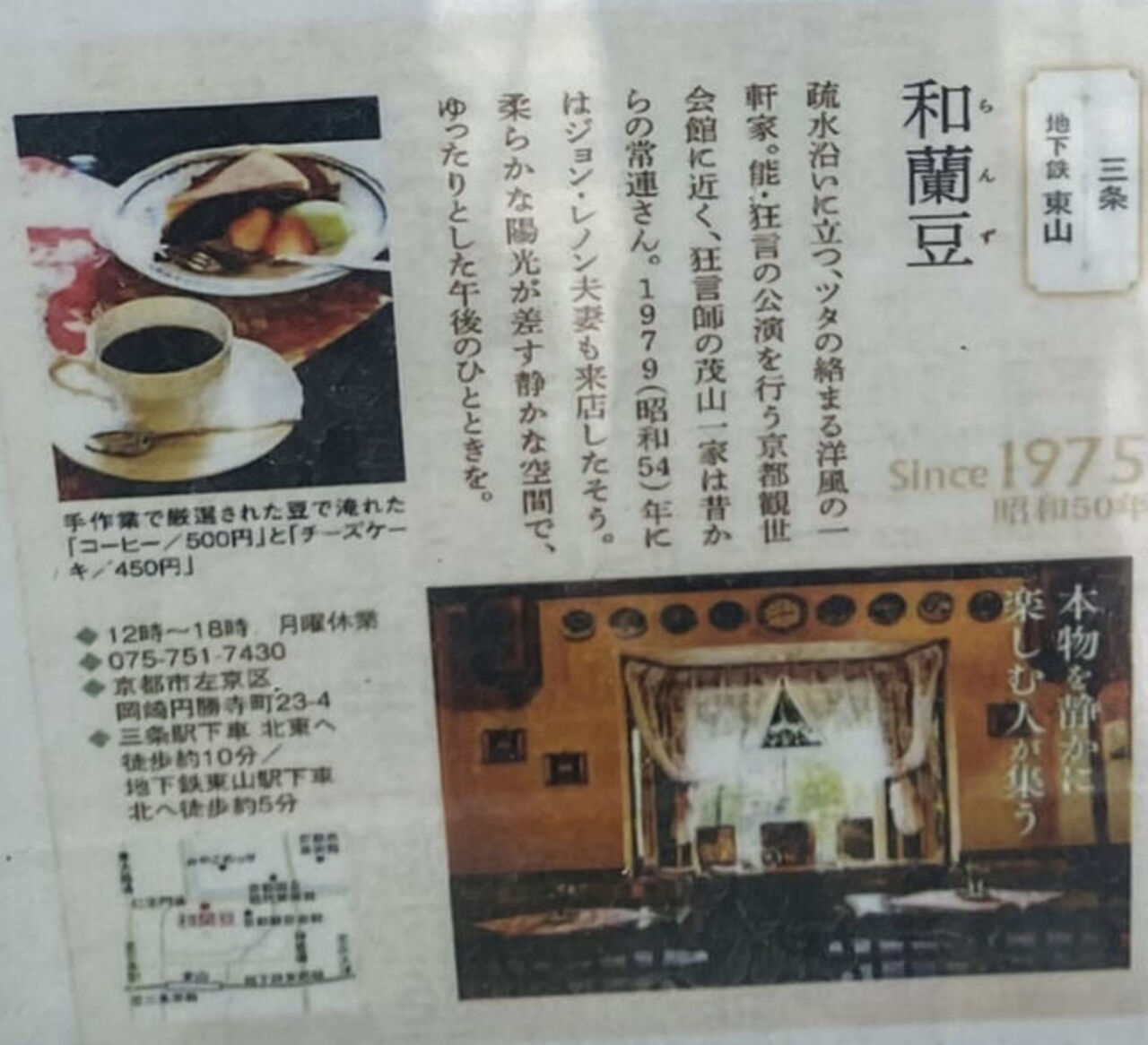 コロナ禍の中閉店したのは知ってましたが、Google mapのストリートビューを見たら建物と何やら出窓に飾ってあるので比叡山の帰りに寄ってみました。場所は地下鉄の最寄駅から徒歩5分、平安神宮の斜め向いにあります。閉店はしてますが、ジョンレノンの使用したティーカップが出窓に飾ってあります。