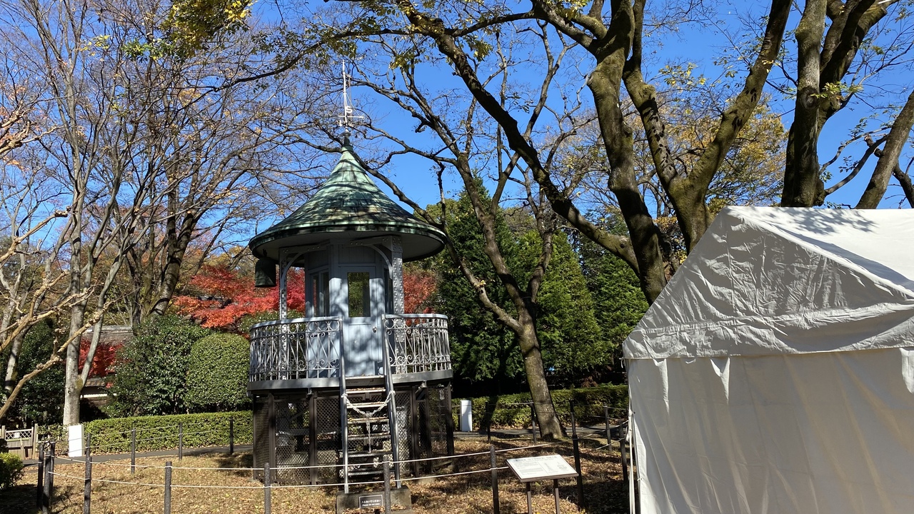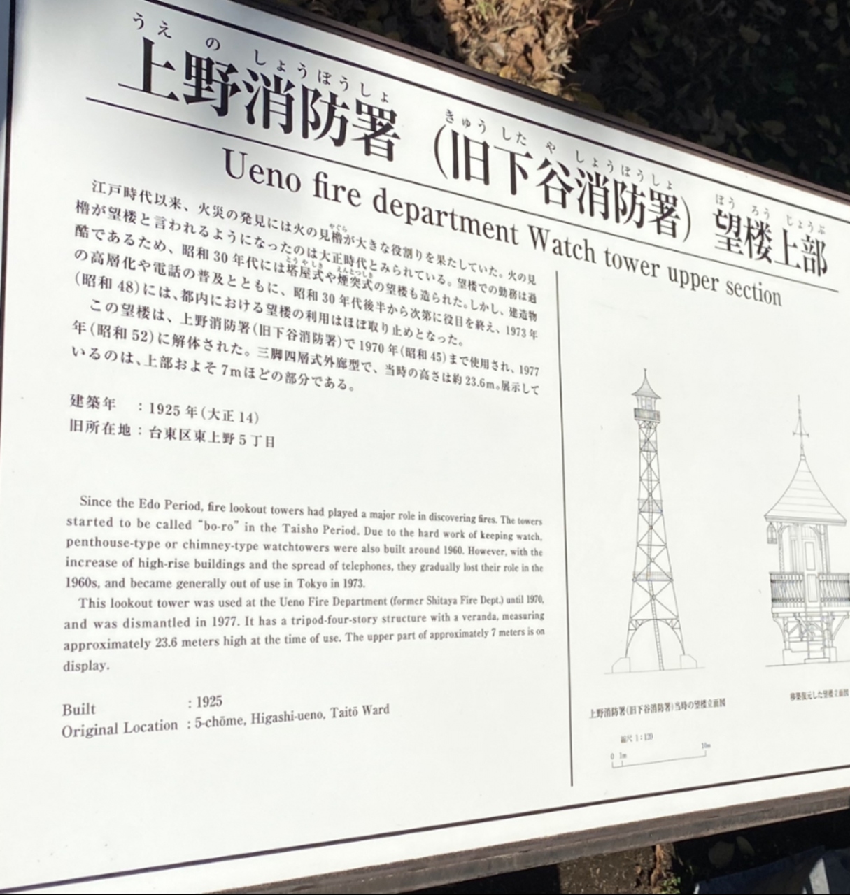 江戸東京たてもの園の東ゾーンの万世橋交番の前にあります。大正14年台東区東上野にあったものを移築のために高さを縮めて保存してあります。実際は約23,6mの高さがあったみたいで昭和45年まで実際に使用してたそうです。。