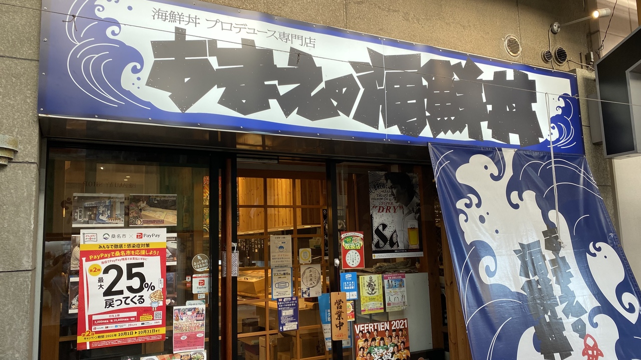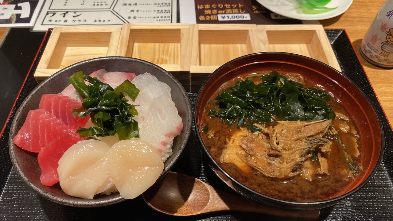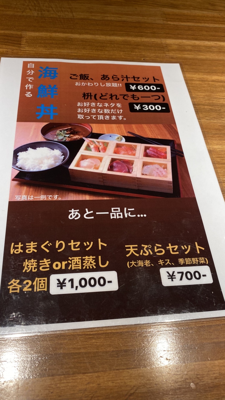 桑名駅でネットサーフィンしてたらみつけました。駅から徒歩15分古い商店街の中にあります。枡に入った刺身を選び、あら汁ご飯セットを頼み自分でのせるスタイル。アルコールもあります。高いですが名物蛤もあります。