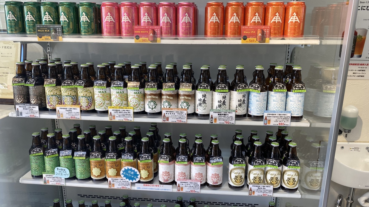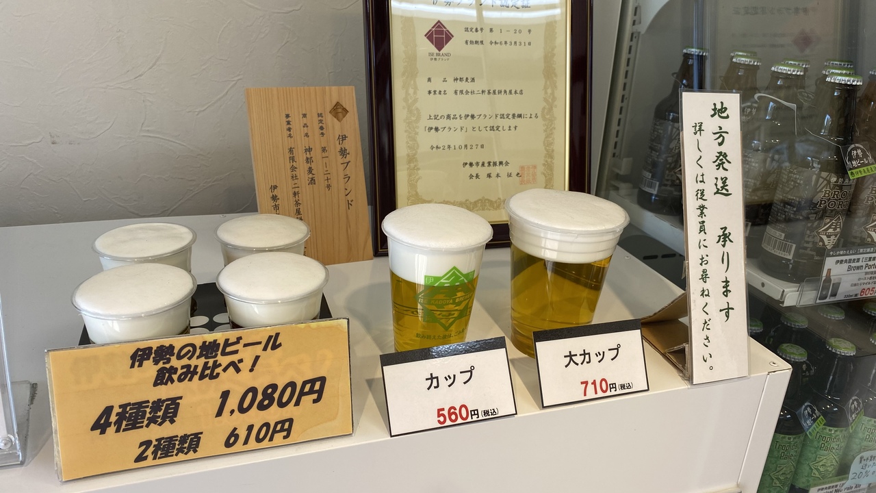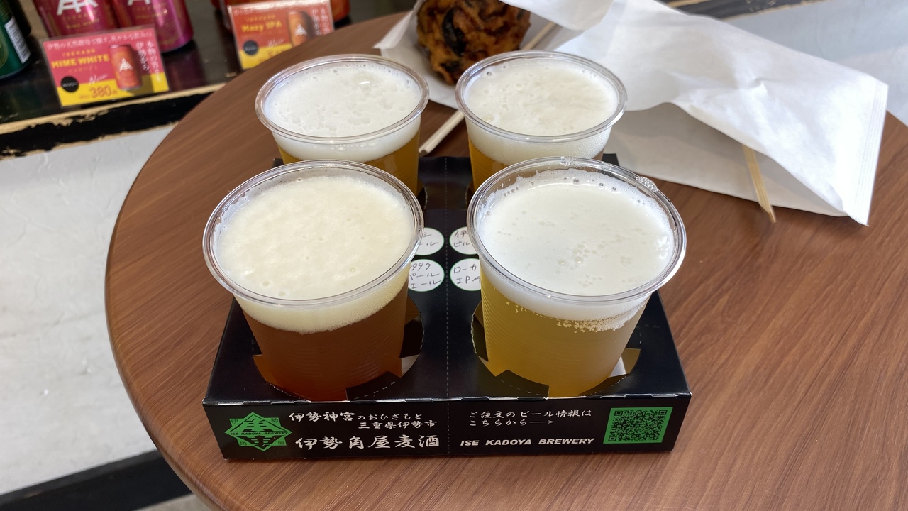 店内は狭いですが、立ち飲みできるテーブルあり。となりに練り物屋があるので持ち込みもOK。地ビールは豊富に種類あり缶ビールや瓶ビールはお土産も可能。4種類飲み比べセットは1080円とお得に全種類飲めます。