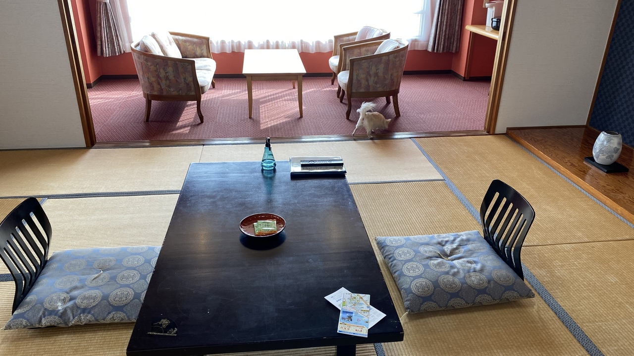 こちらの宿は高台にあり、とりあえず景色がすごくいいです。そして料理も郷土料理の豪華なお膳。今回はみかわ牛コースにしました。ワンフロワーすべてペット用の広い和室でゲージも借りれます。夕食は部屋食なのでペットと一緒に食べれます。朝食は大広間での食事になるのでお留守番ですが。。。お風呂は露天風呂からの眺めはサイコーです。