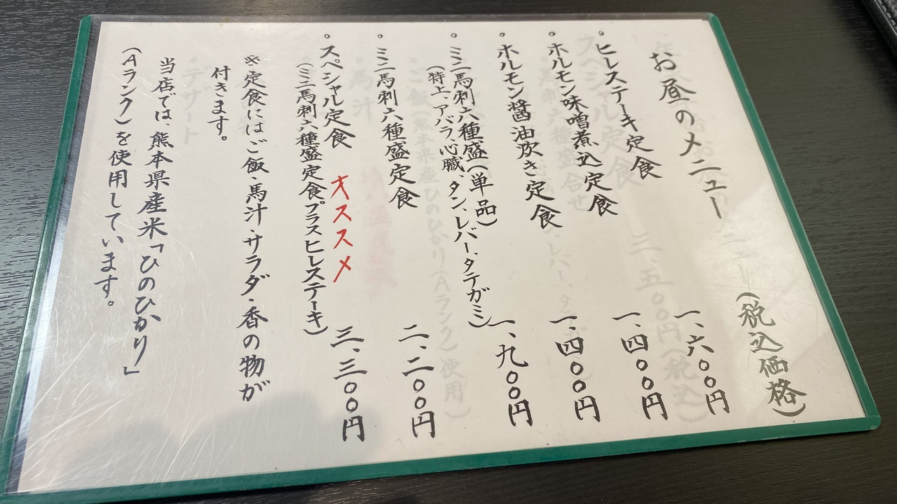 ランチで馬刺しを食べれるところをネットサーフィンしたら見つけました。バナナマンのせっかくグルメでもやってた名店です。いろんなコースがありますが、馬刺し6種盛り定食はおすすめです。駐車場が少ないので注意。