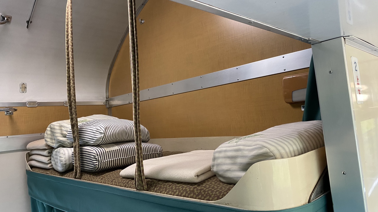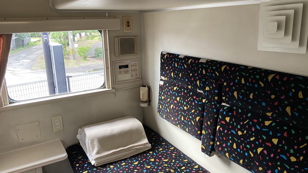 秋田の小坂レールパーク、岩手とここ九州の多良木町に現在国内3カ所ブルートレイン宿があります。今年中に四国高松にもオープンする予定です。ここはB寝台個室ソロに泊まれます。宿泊者には目の前の日帰り温泉施設に無料で泊まれます。が、夕食や朝食取る場所がないですが、スーパーとコンビニは近くにあります。