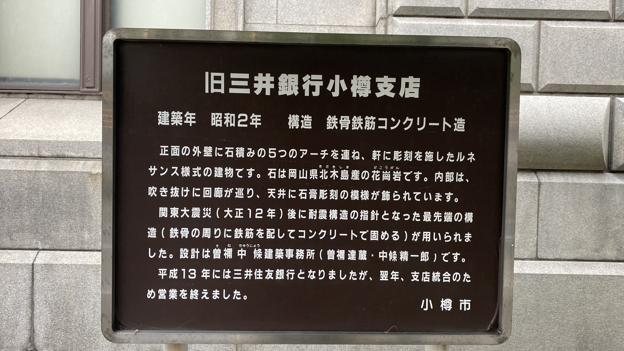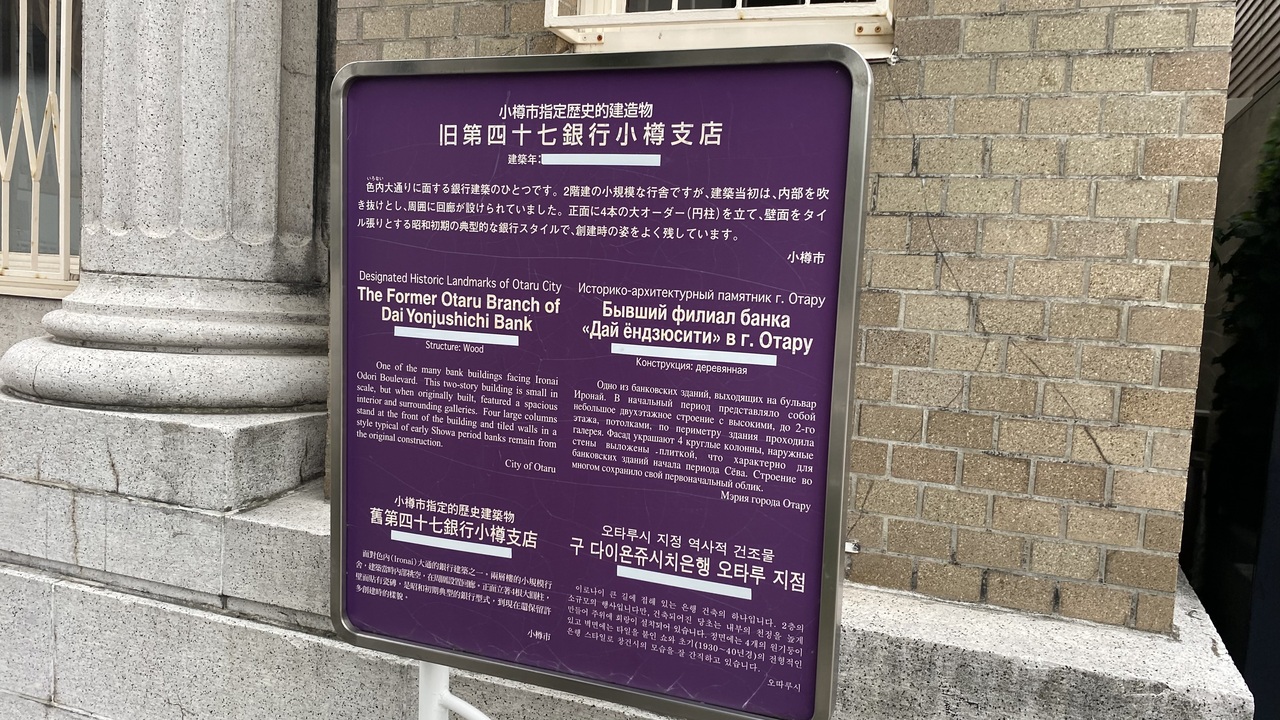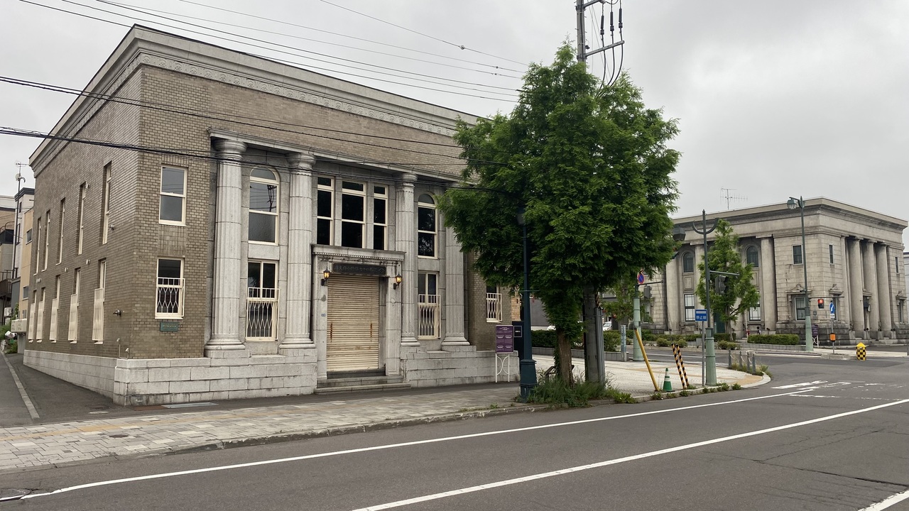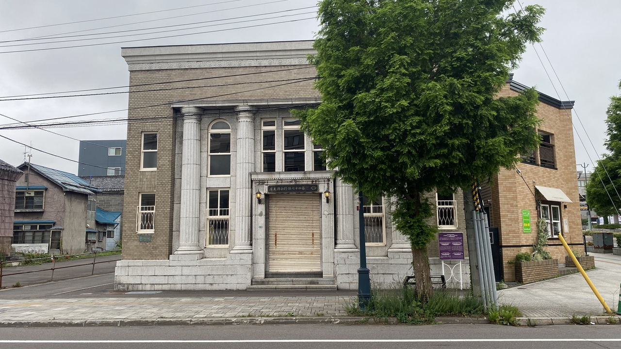 JR小樽駅から小樽運河に行く途中にあります。他の銀行の建物の中では小ぶりです。昭和11年に建てられたそうです。他の銀行の建物は鉄筋コンクリートが多いですが、木造2階建てだそうです。円柱の柱はこの時の銀行建築の主流だったみたいです。