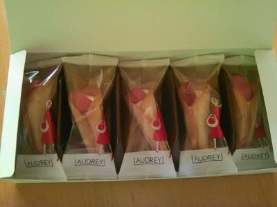 ここのオードリーさんは、東京メトロ日本橋駅からすぐのところにある、日本橋高島屋の中にあります。可愛らしいイチゴのデザイン、そしてなんともおしゃれなエクレアで有名です。今回はグレイシアという、チュイールのお菓子をいただきました。チュイールのなかにはミルククリームと可愛らしい甘酸っぱいドライストロベリー。お祝いのブーケの形をしています。