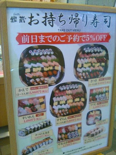 ここの銀蔵さんは、横浜市営地下鉄ブルーラインとグリーンラインの止まる駅、センター南から二、三分のところにある、港北東急SCの中にあります。カジュアルなお寿司やさんです。テイクアウトで、すいれんのセットをいただきました。テイクアウトは前日までの予約で5パーセント引きになります。