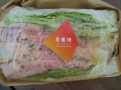 ここのRAIZIN R番地は、東京メトロ表参道駅の表参道交差点の一角にあるカフェです。できてからまだ間もないかと思います。このロケーション自体が非常に目立つのに、なおかつ派手なオレンジのデコレーションでもっと目を引きます。アメリカのスクエアみたいな感じでしょうか。この一角にあるカフェで、お天気のいい時はテラスベンチのような場所でもいただけますし、テイクアウトもできます。今回はローストポークのグラムサンドをいただきました。ひとつ594円(税込)となかなかにのお値段ですが、かなりボリューミーで一回で食べるとお腹いっぱいになります。