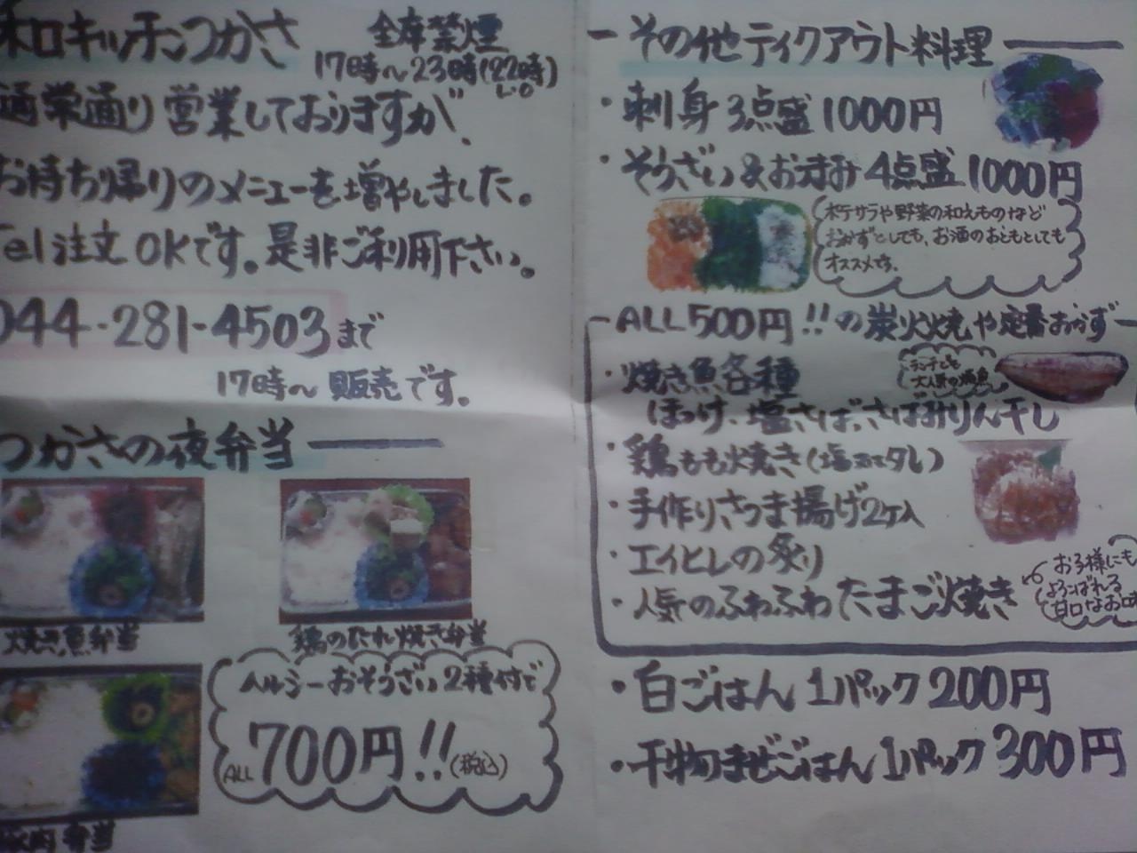 ここの和キッチンつかさは、小田急線向ヶ丘遊園北口から8分くらいのところにあります。階段を登っていくと小さなアットホームなk感じの居酒屋さんがあって、家庭料理のような、体に良い和食の品々を作ってくれます。様々なお惣菜やお弁当、おかずやおつまみのセットなどのテイクアウトも出していて、今回はお弁当をいただきました。お弁当は焼き魚、豚肉、鶏のたれ焼き弁当の3種類があり、鶏のたれ焼き弁当にしました。たれの味のついた鶏がとても美味しかったです。カードは使えません。お弁当は17時から買えます。