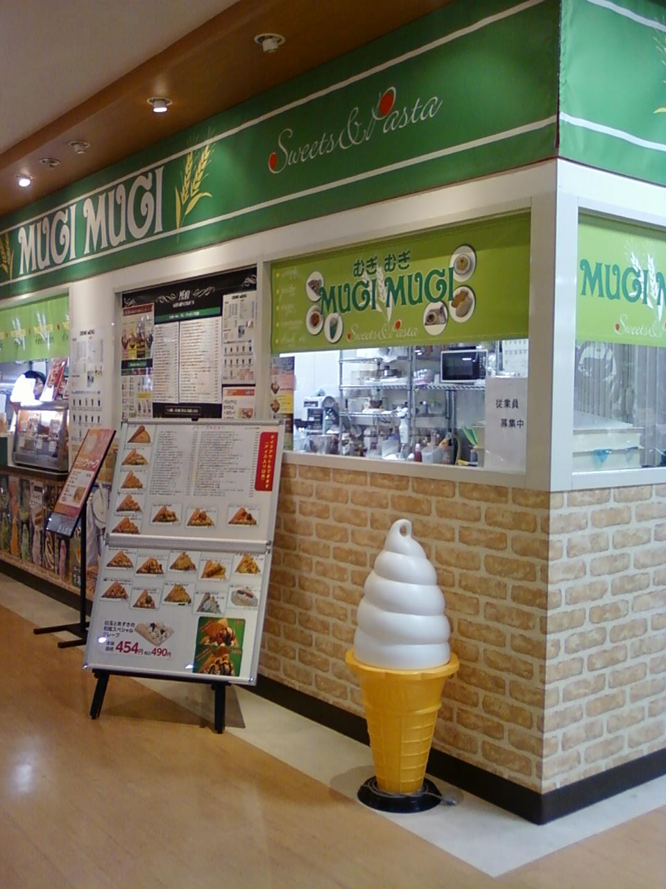 ここのムギムギさんは、小田急線海老名駅から5分くらいのところにある、イオン海老名店のフードコートにあります。クレープやたい焼き、ソフトクリームなどを売っているお店で、まさにフードコートという感じです。ここのピザたい焼き、酸味と皮の甘みがマッチしてとてもおいしかったです。150円です。ぜひおすすめです。