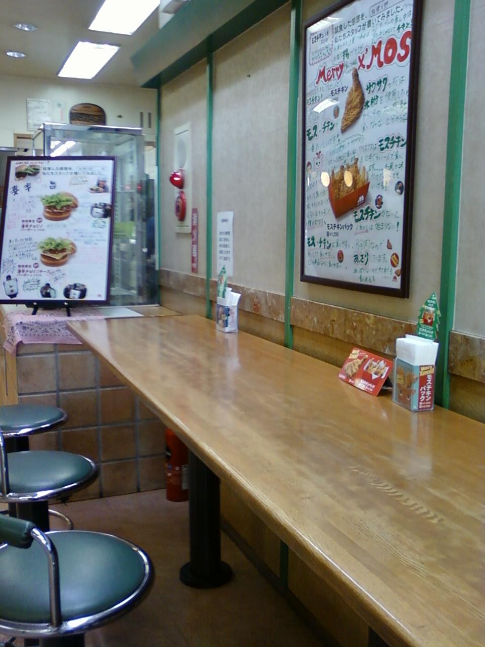 ここのモスバーガーさんは、小田急線相模大野駅から四分くらいのところにあります。伊勢丹の方に向かって、駅から来ると左手の階段を降りたところにあります。店内は多少老朽化が目立ちますが、奥行きがあって、テーブル席は落ち着きます。ライスきんぴら(320)を食べましたが、とてもヘルシーな食べごたえでした。店員さんがとても元気があって、こっちまで元気になりそうな感じでした。