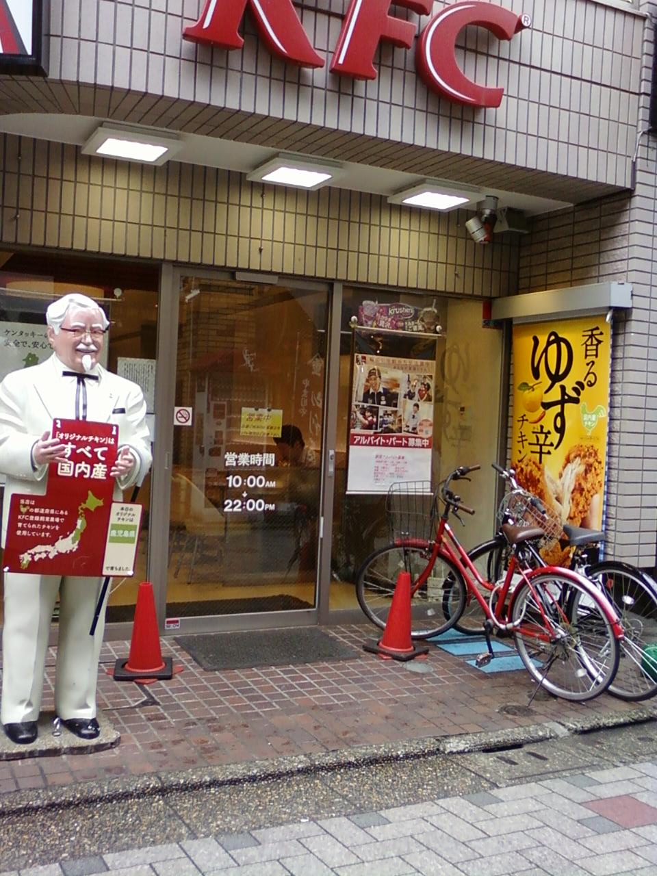 ここのケンタッキーさんは、京王線仙川駅のすぐそばに広がっている仙川商店街の中にあります。商店街の中ほどでしょうか。よくある朝10時から夜10時のお店で、地元に非常に根付いている感じのお店です。加工した鶏肉がメインのお店なので、生産地の表示にはすごく気をつかっていますね。カーネルおじさんが国内産をアピールする札をぶら下げていました。