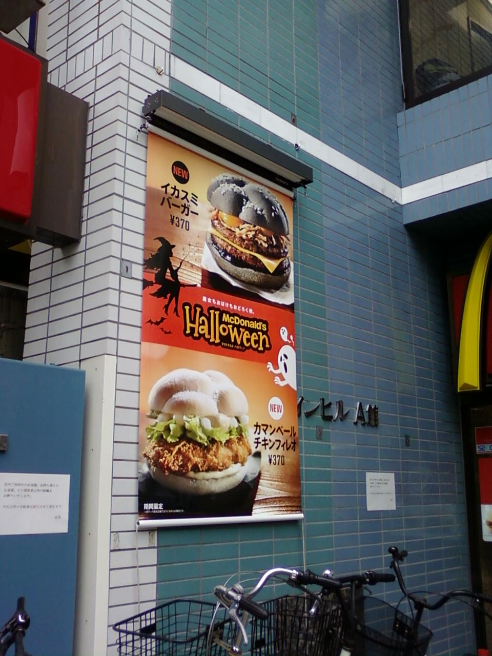 ここのマクドナルドさんは、京王線仙川駅のすぐそばに広がっている、仙川商店街の中にあります。ここ最近逆境に立たされている感の強いマクドナルドさんですが、どんな時も変わらないファンの人たちが来ていますね。月見バーガーの後はハロウィンのハンバーガーを販売していました。見た目は黒で少しグロテスクな感じもしましたが、イカすみを使ったイカスミバーガーです。