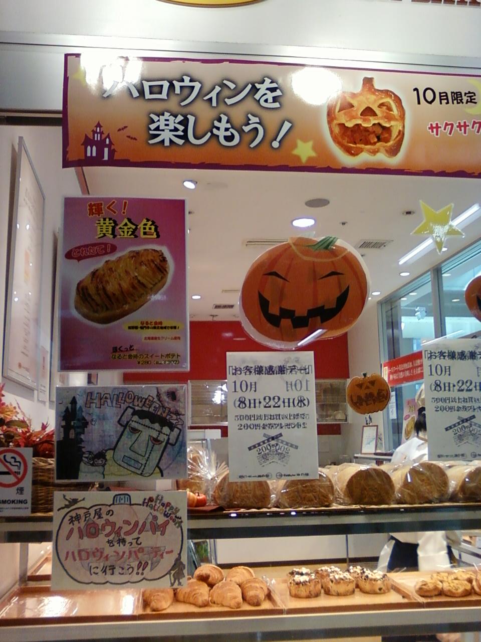 ここの神戸屋さんは、 横浜市営地下鉄センター北駅改札すぐ右脇にあります。結構横浜市営地下鉄の駅の改札脇に神戸屋さんがありますが、地下鉄のせいか、結構暗いところが多い一方、ここは特に明るくて入りやすいですね。ちょうどハロウィンのキャンぺーンをしていました。