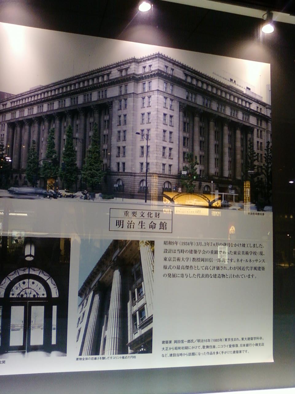 明治生命館は、東京メトロ千代田線の二重橋駅すぐそばにあります。非常に重厚かつ華やかな造りの建物で、ネオルネッサンス様式というんですね。見とれてしまいます。丸の内を代表する見所で、かつ、日本の近代史を知る上でなくてはならない存在だと思います。
