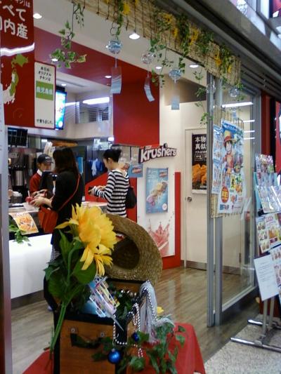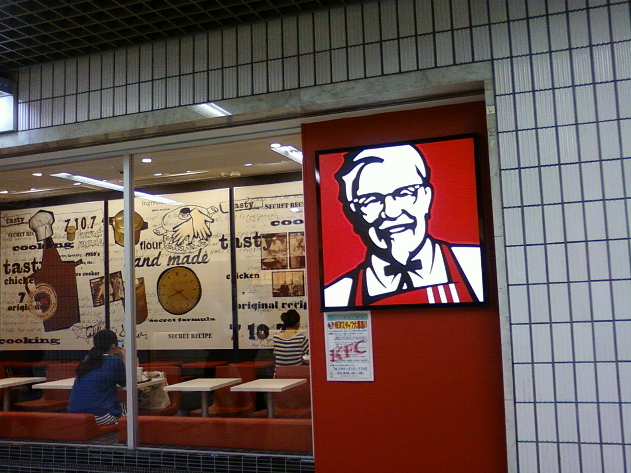 ここのケンタッキーフライドチキンさんは、JR川崎駅、京急川崎駅、モアーズさんなどをつないでいる、地下アゼリア商店街のレストランが並ぶ通りにあります。店内は目立つ壁紙などがあって、ほかのケンタッキーの店舗に比べるとかなり内装を工夫しています。今は夏真っ盛りの感じで、入り口に風鈴やひまわりがありました。明るい店内を全面的にアピールしていて、オープンで入りやすいお店ですね。