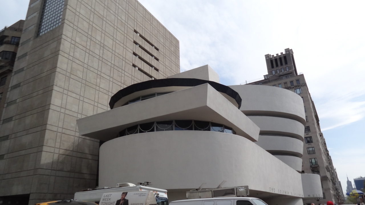 グッゲンハイム美術館は、セントラルパークのジャックリーヌ・オナシス貯水池のすぐそば、東側にあります。アメリカの有名な建築家、フランク・ロイド・ライトが設計した建物で、館内の展示作品も面白いですが、建物自体が非常に興味深いです。おそらく何十年先の世界で見たとしても、その新しさ、すがすがしさは続いているのかな、と思わせる驚異的な建築物です。