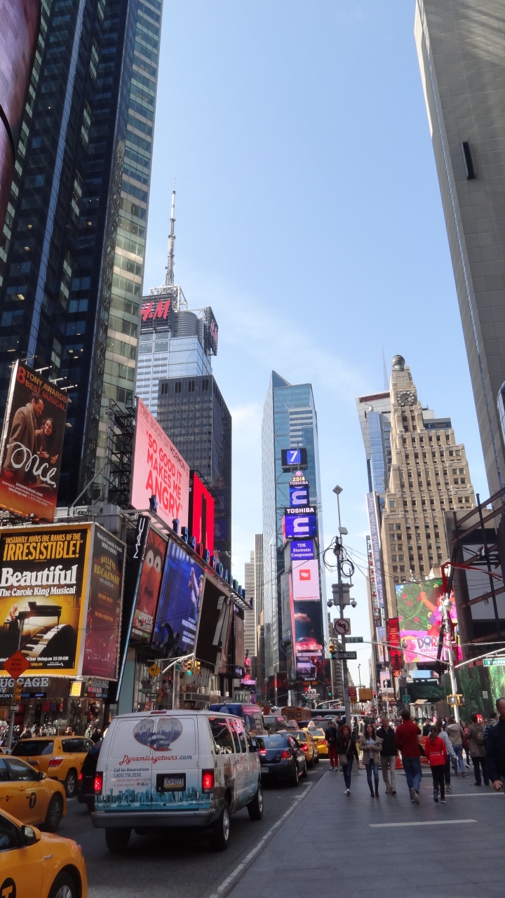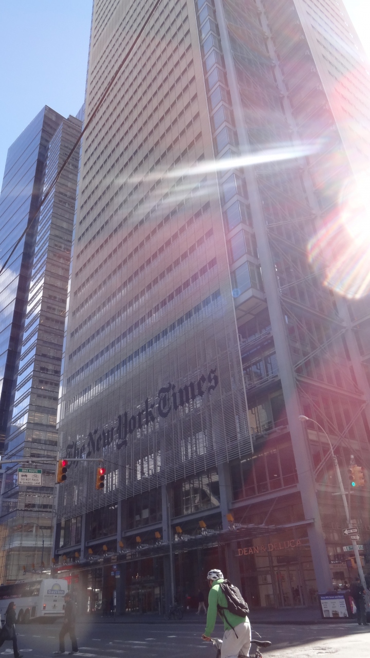 ニューヨーク・タイムズ社は、ニューヨークの八番街沿いにあります。ガラス張りのおしゃれな建物で、特にお天気のいい日でしたので余計に美しく見えました。建物内はオレンジの壁、正面玄関から一階の奥まで吹き抜けになっていて、裏の緑まで見えました。一階の脇にはDEAN&DELUCAがあり、まさにNEWYORKという雰囲気を味わえます。