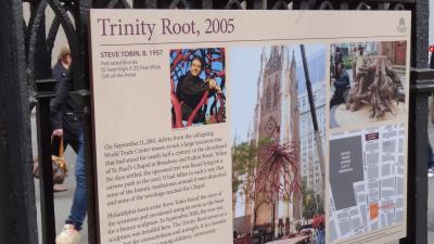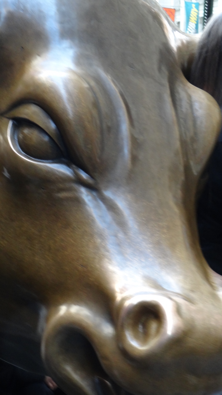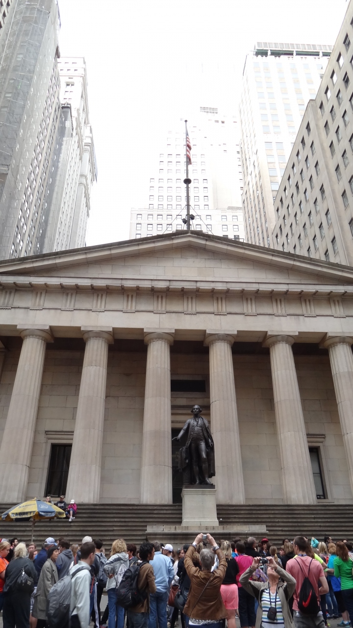 フェデラルホールは、ウォール街の通り沿いにあり、このあたりで最も多くの人が集まっているスポットと言えるかもしれません。正面にはアメリカの建国の父、ジョージ・ワシントンの像があって、ここのバルコニーで大統領就任演説をしたという情景が浮かんでくるようです。1ドル紙幣で見慣れたお顔ですが、この像のほうがもっとリアルで威厳があるように見えました。