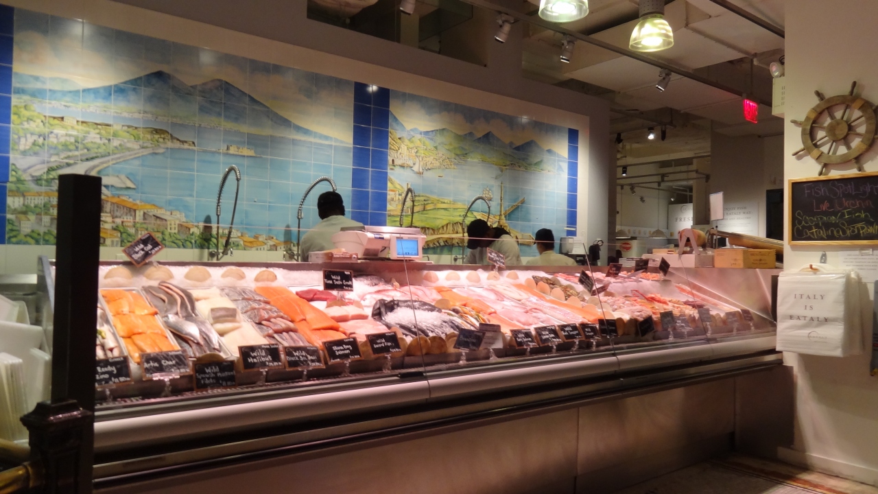 イータリーは、ニューヨークで有名なイタリア食材のお店です。日本でも結構有名になってきましたね。ジェラート、サラミ、ハム、コーヒー、パスタ、お菓子、全てが魅力的ですが、新鮮な魚も手に入るのが良いですね。多少高めですが、ちょっと贅沢をしたい食事にここに来て調達すると良いかも。