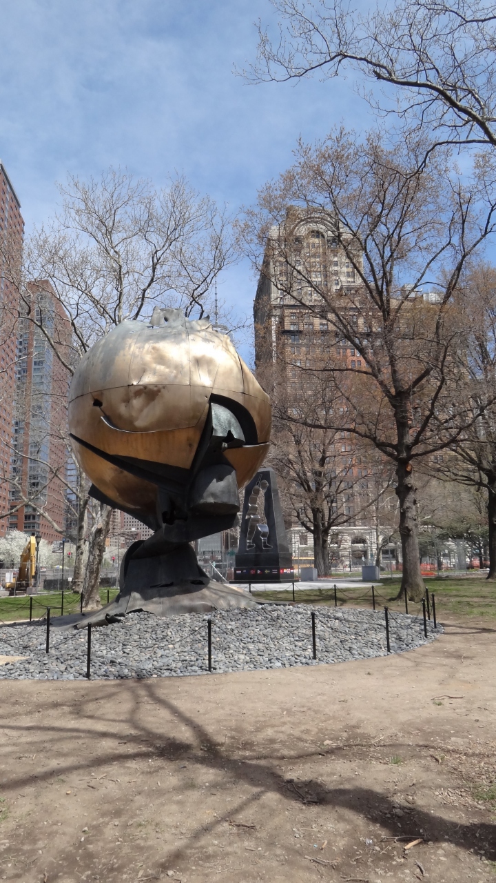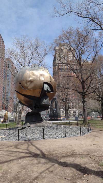 バッテリーパークはマンハッタンのかなり南、自由の女神のあるリバティアイランドに行ける、スタチュークルーズの発着場としても有名です。この公園内にはさまざまなモニュメントがあるのですが、特に目を奪われたのが、彫刻家、Fritz KOENIGの作品です。かつてはワールドトレードセンター前にあったオブジェで、9・11の際に残酷な被害を受け、形が原型をとどめていませんでした。記憶を風化させない、心に訴えるモニュメントです。