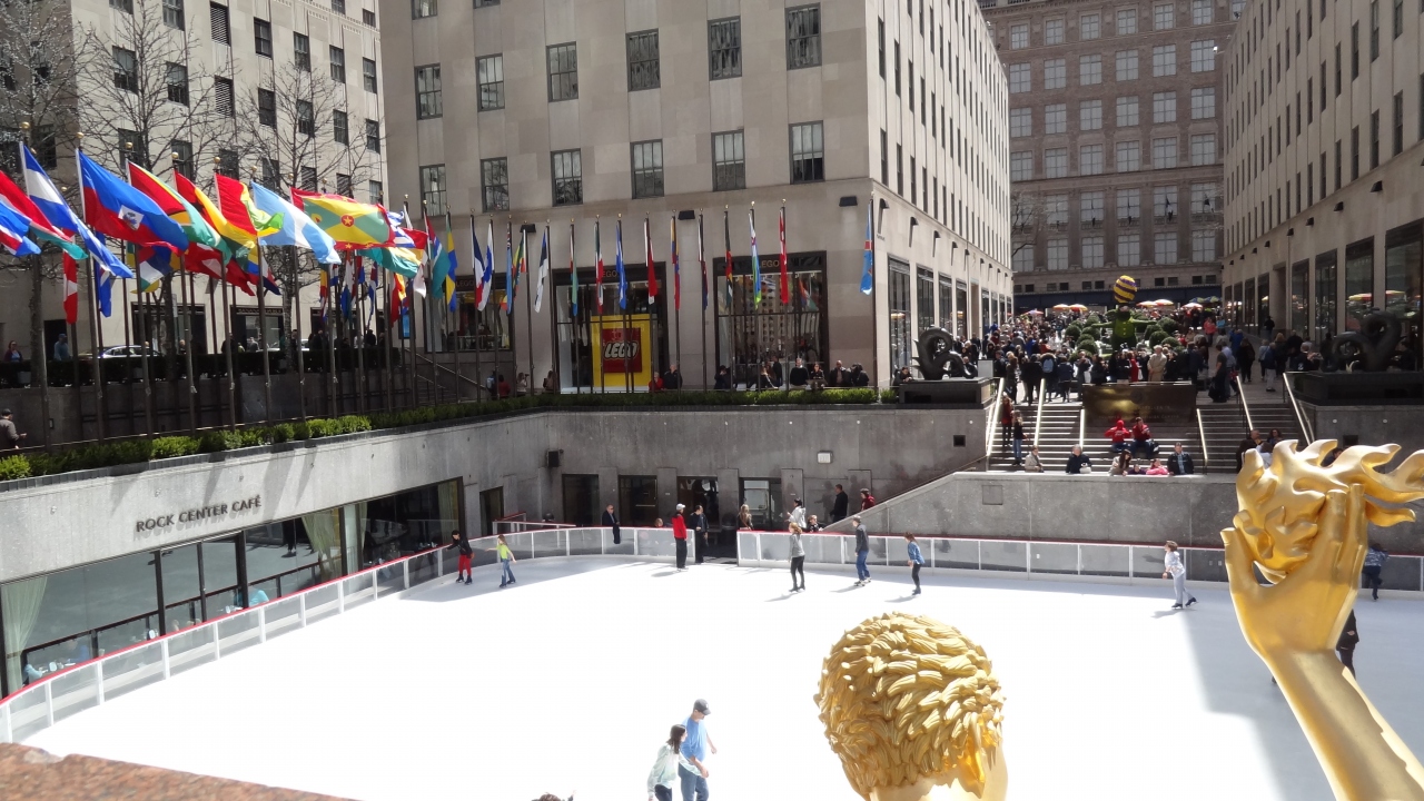 ロックフェラーセンターは、トップオブザロックの展望台があるGEビル、そしてプロメテウス像が輝いている、ロウワープラザで有名です。ここのスケートリンクもおなじみですね。たくさんの各国の旗がひらめき、スケートリンクの脇にはカフェがあって、そこからは外の様子を見ることができます。週末にはたくさんの家族連れ、そして観光客と、多くの人でにぎわっています。