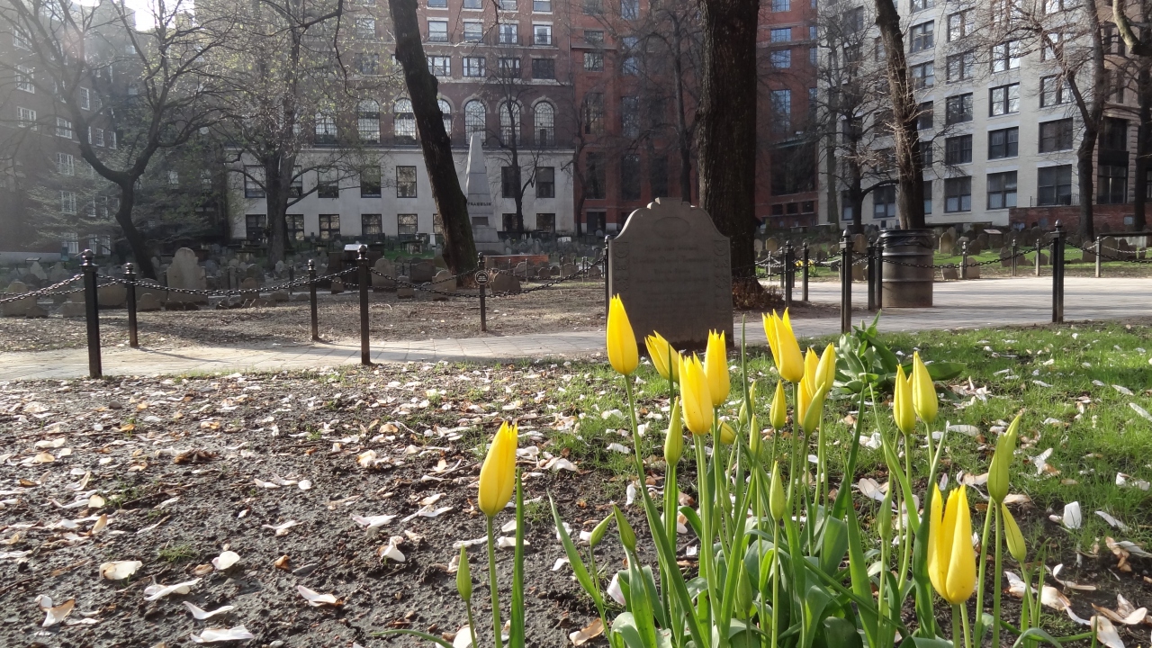 グラナリー墓地は、ボストンで人気の史跡を巡るウォーキングコース、フリーダムトレイルのコース内にあります。黒い柵の入り口で、墓地内の地図を配ってくれているお兄さんがいました。最初は何か署名運動かと思い、無視しそうになったので悪かったです。ここにはアメリカ独立に人生をささげた、サミュエル・アダムス、ジョン・ハンコックなどの墓があります。地元の学生たちの社会見学コースにも使われているようです。晴れた日はお花がきれいに咲いていますね。