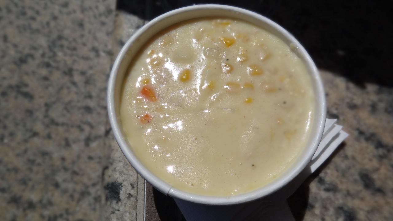 ここのボストンチャウダは、ボストンのファニエルホールの中にあります。ファニエルホール内はたくさんのファストフード店などが軒を並べてとてもにぎやか、どのお店も魅力的です。特にここは人気があるようでお客さんが並んでいました。チャウダーと一口で言っても、ボストンのもの、マンハッタンのもの、プリマスのものいろいろとありますね。プリマスのコーンチャウダーを選んでみました。スモールサイズで4、27ドルは高いですが、食べてみておいしさに納得です。
