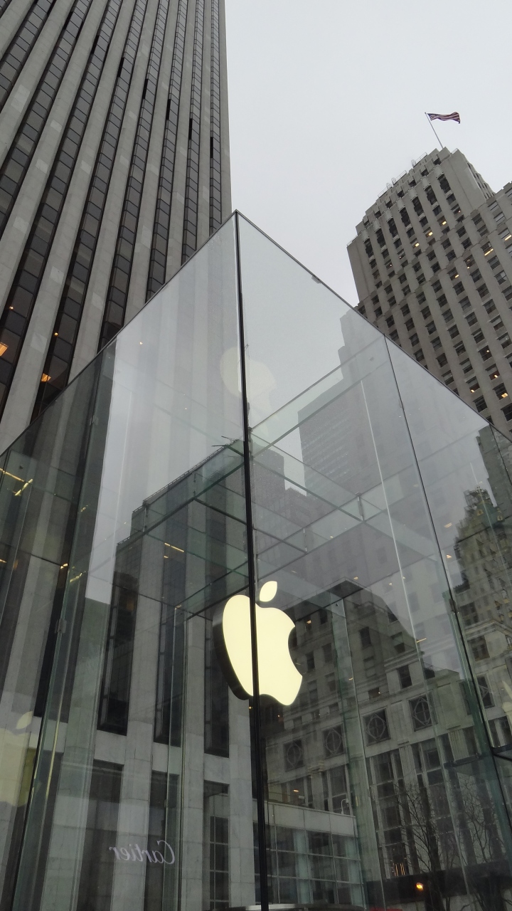 ここのアップルストアは、ニューヨークの五番街、超高級ホテルのプラザホテル目の前にあります。他の建物の景観の邪魔にならないためか入り口には透き通ったボックスにりんごのマークが浮かんでいます。階下にフロアがあってお祭りのようにたくさんの人がいました。熱気を感じますね。