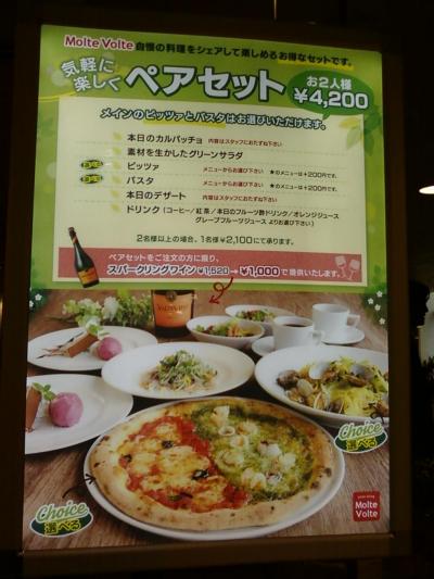 ここのパスタダイニングモルテボルテさんは、新宿駅西口に連結している、小田急デパート本館の12階にあります。カジュアルなパスタやピザのお店で、お得な2名からの4200円セット(1人2100円)で、パスタ、ピザ、デザート、カルパッチョ、サラダ、ドリンクのすべてをいただけます。たくさんたべたい人や家族連れなどにはお勧めです。