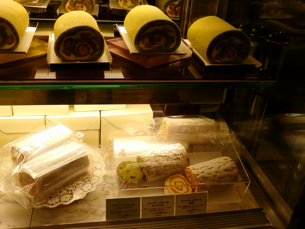 ここのキハチさんは、新宿駅東口から4分くらい、また、東京メトロ新宿三丁目駅から直結している新宿伊勢丹の地下1階、フードコートの中にあります。キハチさんといえば、生クリームたっぷりのフルーツのロールケーキが大好きなんですが、最近はなんとダックワーズのロールケーキも出しているんですね。あのダックワーズの軽やかな食感とクリームがマッチして至福です。