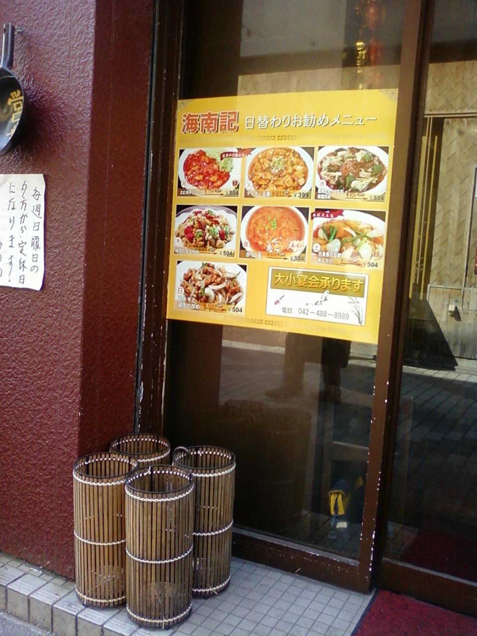 ここの海南記さんは、京王線調布駅北口から4分くらい、天神通り商店街を入ったところにあります。中華レストランで、たくさんの中華メニュー、そしてお弁当などもあります。日替わりお勧めメニューいうのがあり、曜日ごとにメニューの中から割引き料金で提供してくれるものがあるのでそれが楽しみです。なぜかおばちゃんのお客さんが多いのには驚きました。