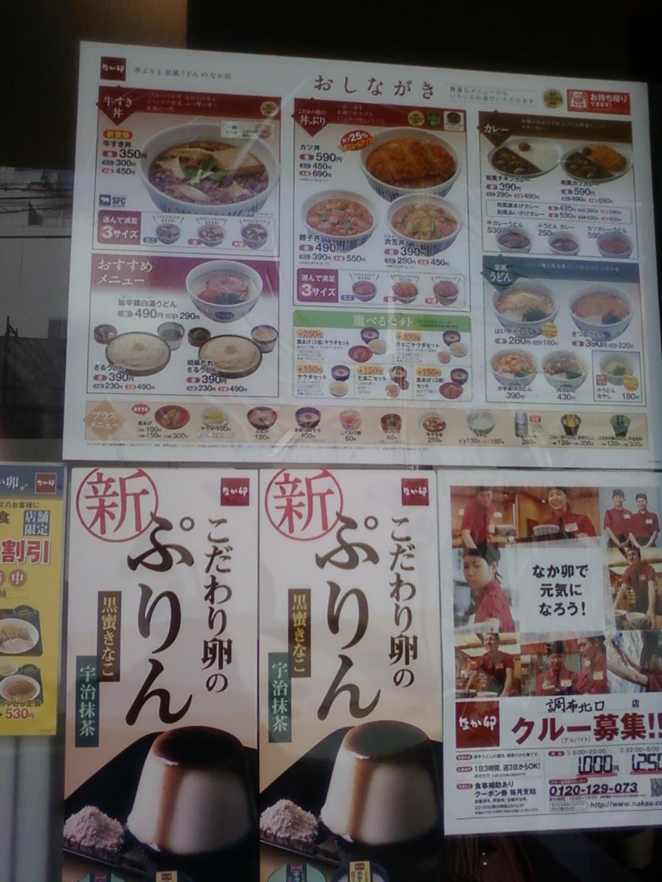 ここのなか卯さんは、京王線調布駅北口から4分くらいのところにあります。親子丼などの鳥の専門店のイメージが強かったのですが、牛すき丼やカツカレーもあるんですね。ファストフードながら、なぜかほんわかした雰囲気と細やかさを感じるのは私だけではないようです。最近は抹茶やきなこのぷりんも扱っていて、ますますほんわかしてきました。女性のお客さんが多いのも納得です。
