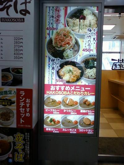 ここの箱根そばさんは、小田急線登戸駅の駅構内にあります。階段の脇で、つい素通りしがちですが、季節によって一部メニューを変えているものもあるので注目です。カレーなんかもかなり種類があるんですね。300円、400円で食事ができますし、朝も7時からあいているのでありがたい存在です。