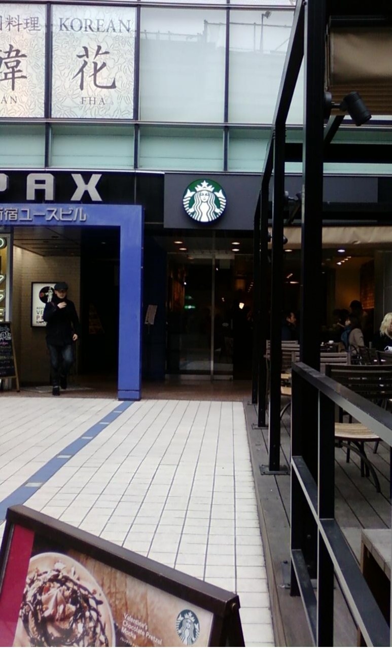 ここのスターバックスカフェは、新宿駅東南口からタカシマヤタイムズスクエアに向かう道沿いにあります。エントランスが少し奥まったところにあるので、通り過ぎてしまう人が多いかもしれませんが、エントランス前のテラス席がまあまあスペースあるので、お天気の良い日は気持ちいいかも。お天気が良くないと、少し暗い雰囲気が残念です。