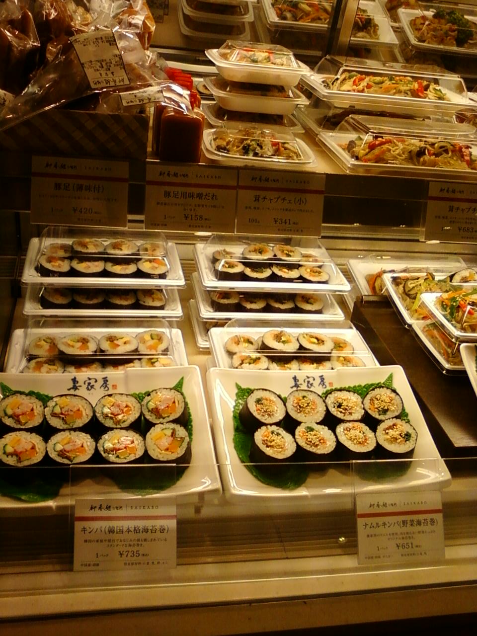 ここの妻家房さんは、新宿駅東口から4分くらい、東京メトロ新宿三丁目駅に連結している、新宿伊勢丹百貨店の地下1階にあります。このお店はお惣菜屋さんおよびレストランとして最近あちこちで見かけるようになってきたのですが、特にキンパ(韓国風海苔巻き)がリーズナブルでおすすめです。日本の海苔巻きよりも味にめりはりがあって、結構ビールに合うかも。