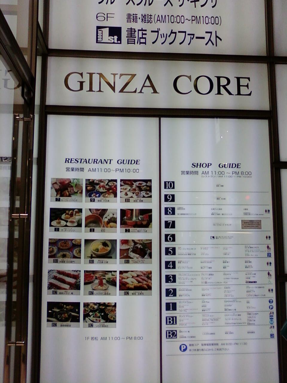 銀座コアさんは、東京メトロ銀座駅A3、A4出口からすぐ、東銀座駅A1出口から二分もしないところにあります。地下二階、地下一階、1、2、9、10階にレストランが入っていて、もちろんファッションブティックだけでなく、建物内には両替商あり、クリニックあり、書店ありとさまざまな機能を担っています。広島テレビ放送まで入っているとは意外でした。多角的な展開をしているんですね。