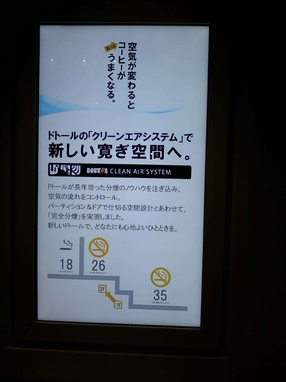 ここのドトールさんは、東京メトロ京橋駅からすぐのところにあります。ドトールの最新のクリーンエアシステムを導入して、かなりきれいに快適になっていました。広告もスクリーン式になって最新式のアピールですね。確かにドトールは店内がタバコの匂いのイメージがあったのでこれからこういった店舗が増えていくにこしたことはないかも。