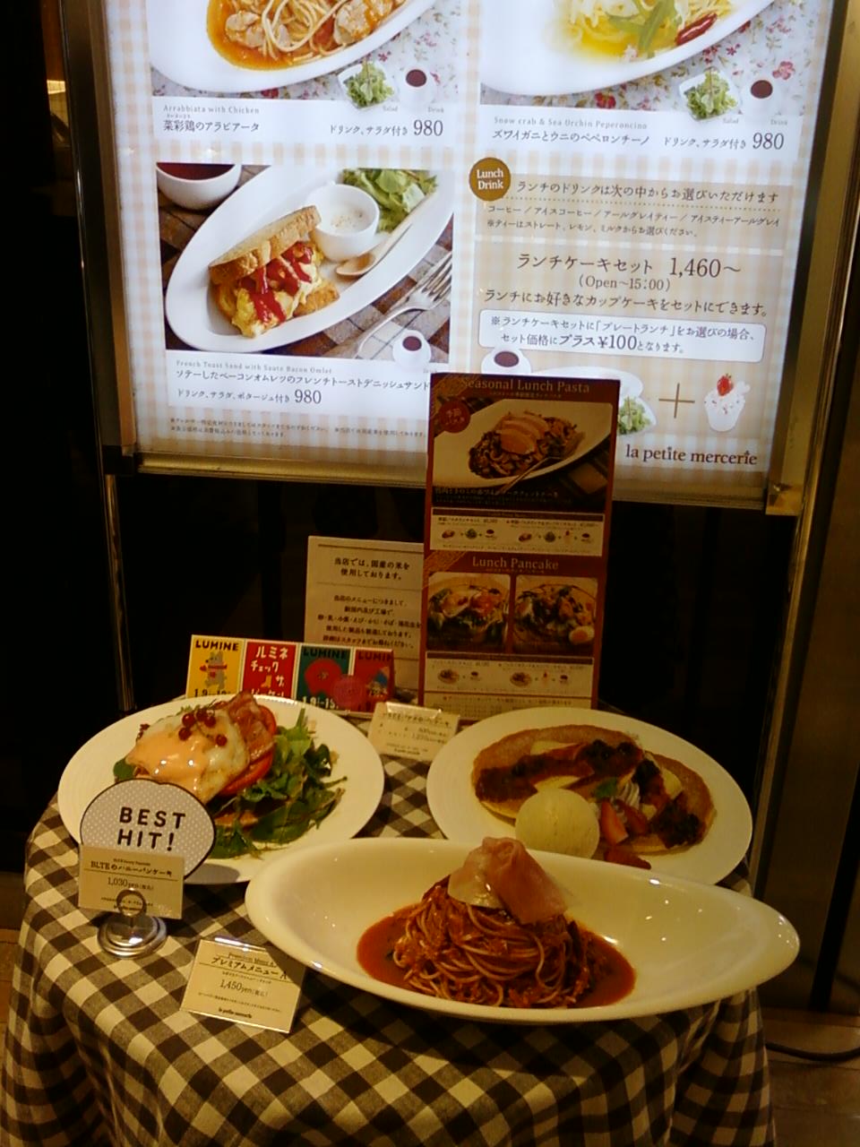 ここのラ・プチ・メルスリーさんは、新宿駅東口に隣接している、ルミネエストの二階にあります。エスカレーターの脇にのほうに壁脇に横に並ぶように席があるお店で、カップケーキの専門店と言っていいのでしょうか?500円台で少し高めですが、とってもかわいらしいケーキがたくさん店頭に並んでいます。ランチメニューはそれでも結構リーズナブルで、ドリンクやサラダがついて980円であるのが良いですね。女性にとっても人気のお店です。