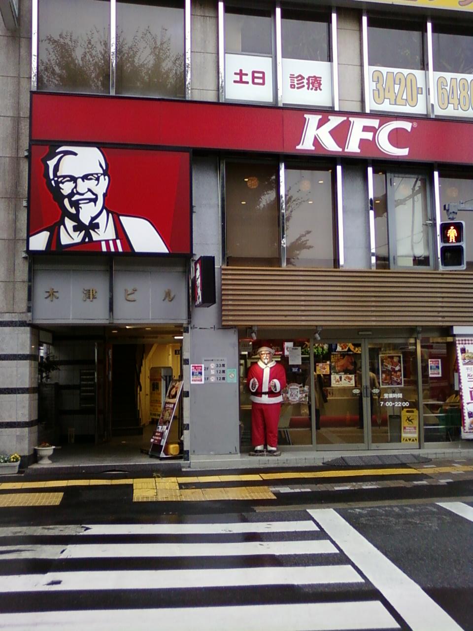 ここのケンタッキーフライドチキンさんは、小田急線経堂駅の北口から1分くらいのところにあります。北口に出るとすぐ右手に赤いお店とサンダースさんが目に入ります。朝は7時からあいていて便利ですね。世田谷のケンタッキーは夜22時にしまる店舗が多いのですが、ここも例外にもれず22時に閉まります。二階建てで、二階は33席の禁煙と12の喫煙席、1階は12席の禁煙席になっています。10月末に来店しましたが、サンダースおじさんがすでにクリスマスの格好をしていました。