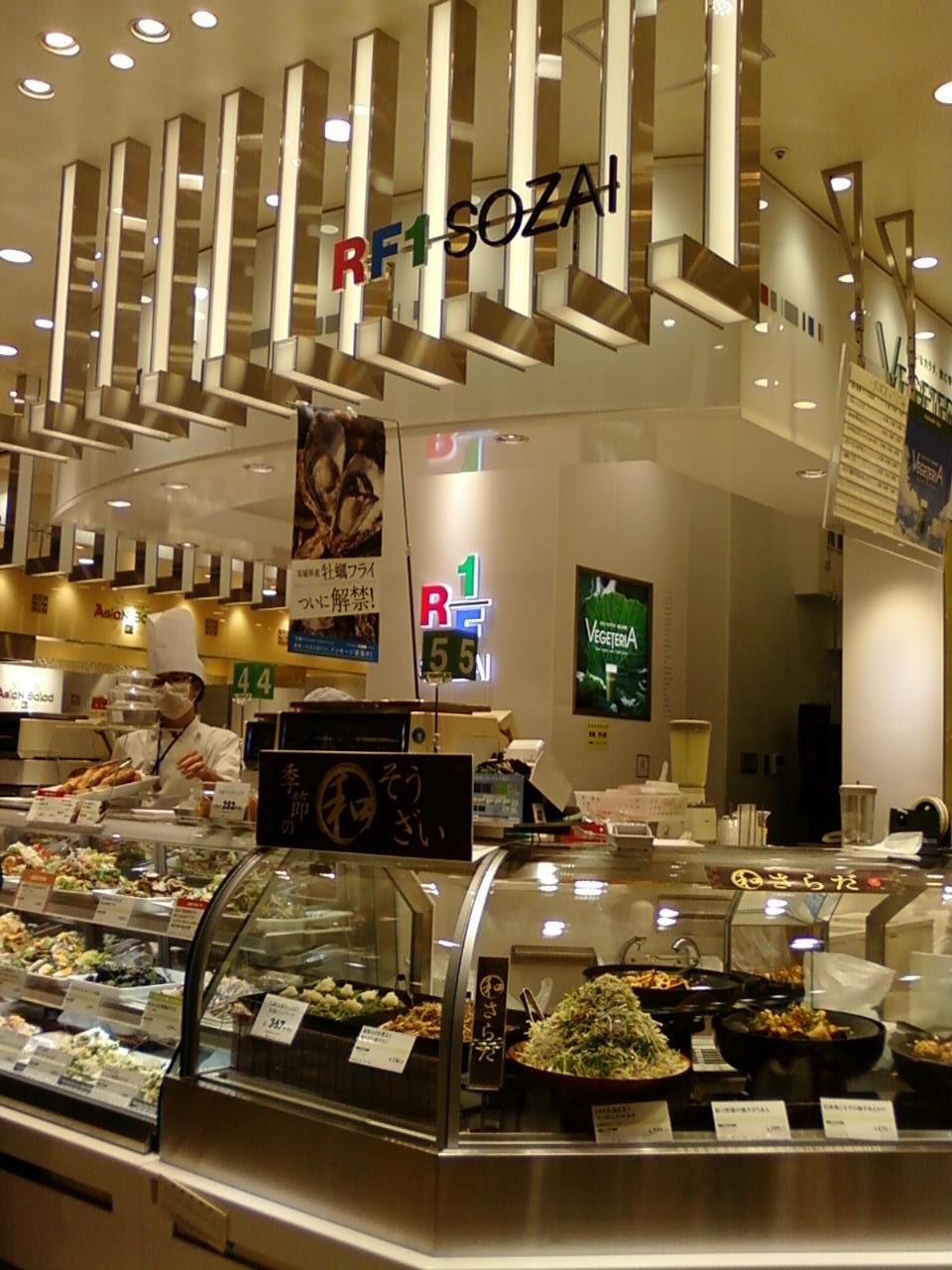 ここのRF1さんは、JR川崎駅に連結しているラゾーナ川崎の一階、グラン・フードコーナーの一角にあります。 どこに行っても大人気のRF1さんですが、ここはべジタリアも隣接していて規模も大きく、川崎駅の改札から来るとエスカレーターを降りてすぐに視界に入り圧巻です。とにかく野菜や魚介類をうまくアレンジしていてヘルシー感にあふれています。店頭のディスプレイも上手なのでたくさんの人がついつい惹かれてしまいますね。店内の光のあて方も上手です。
