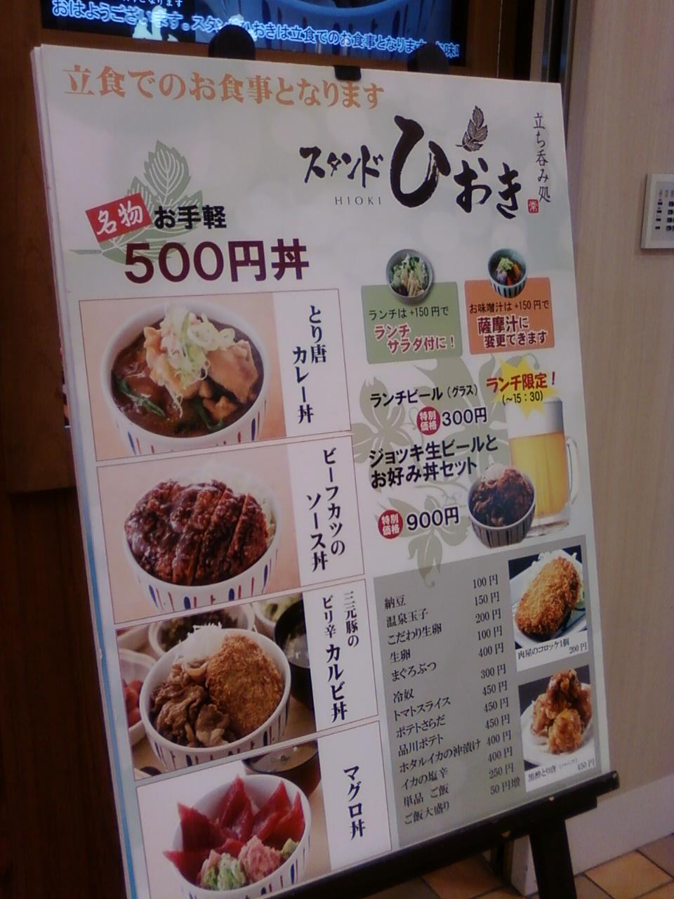 ここのスタンドひおきさんは、JR品川駅の構内にあるエキュート、サウスコートの一角にあります。この場所にはめずらしいスタンド席のお店です。駅のスタンドというと立ち食いそばが一般的ですが、ここはすごくきちんとしたメニュー、できることならゆっくり食べたいメニューがたくさんあります。時間はないけど、いろんなおいしいものを食べたいという人にはもってこいの環境です。