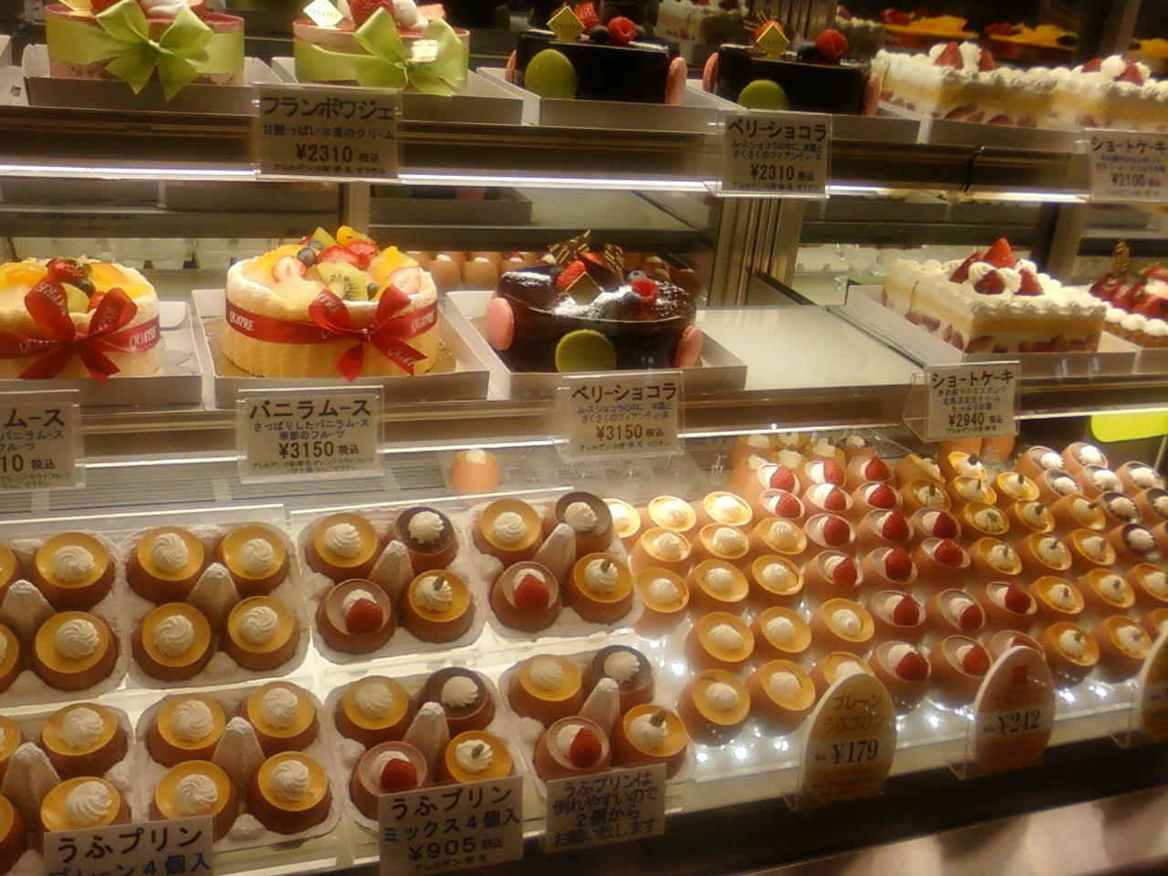 ここの柿の木坂キャトルさんは、JR品川駅の構内にあるエキュート、サウスコートの一角にあります。ちょうど角地の非常に人通りの多い目立つ場所にあるので、ただでさえ色とりどりのケーキが人目をひきますから大変です。ひっきりなしにお客さんが来て、注文の整理に追われる販売員もいます。たまごの殻に入ったうふプリンあり、バウムクーヘンあい、フルーツタルトや焼き菓子ありと、かなりの実力派です。