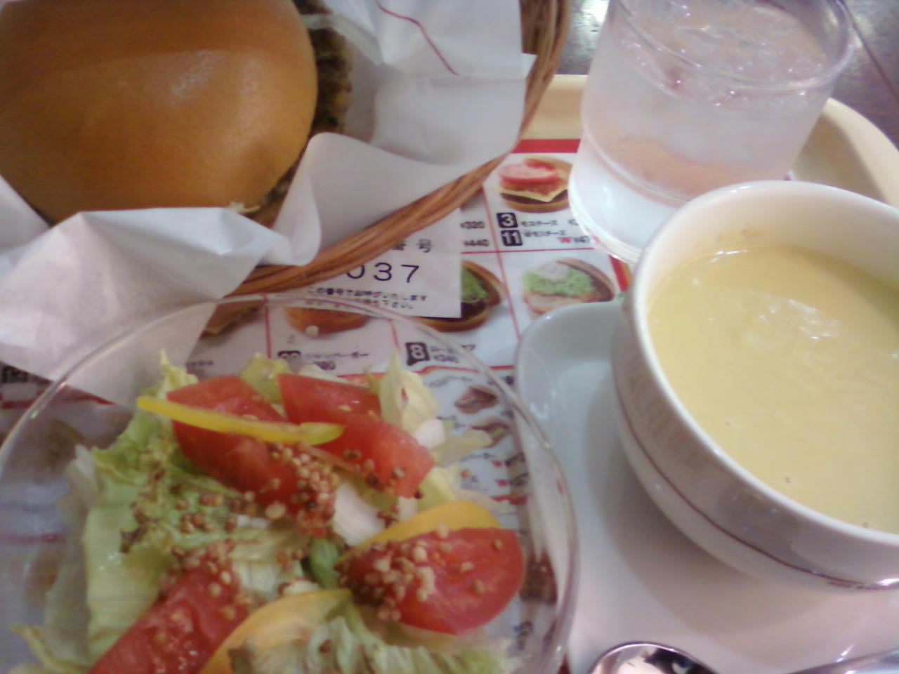 ここのモスバーガーさんは、東急線の梶が谷駅の改札を出て横断歩道を渡り、左側にあります。駅から1分もしないところです。店内は広く深い茶色のテーブルで落ち着きますが、ちょっと暗いのは店員さんに元気がないからかな?トイレがかなり狭いのには驚きました。ここは朝モスがあるからでしょうか、朝は7時から開いていて真夜中までやっています。とびきりハンバーグサンドのとびきりプレーンバーガー(単品は360円)は今までにないリッチな味わいでした。